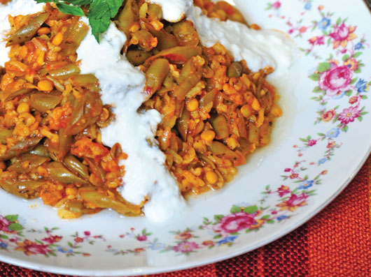 در تابه مناسبی، قدری روغن بریزید و روی اجاق قرار دهید. پیاز را بیفزائید و تفت دهید تا نرم و سبك شود. آنگاه لوبیا سبز را بیفزائید و تفت دهید.