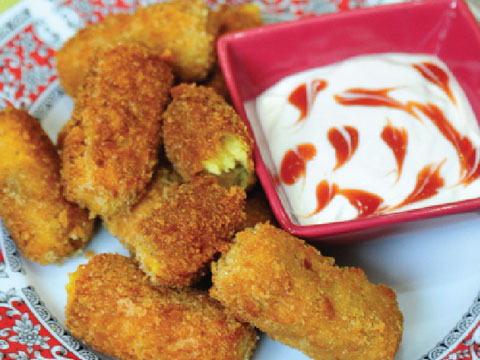 اكنون هر بار به اندازه 2 قاشق سوپخوری از مایه فراهم كرده، بردارید و به شكل تخممرغ درآورید. حال كروكتها را ابتدا در تخممرغ همزده و سپس در خرده نان بغلتانید. آنگاه به میزان كافی روغن مخصوص سرخكردن، در تابه بریزید و روی اجاق داغ كنید.