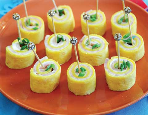 برای تهیه پنكیك، 90 میلیلیتر آب (حدود یك سوم پیمانه) را بجوشانید، آرد را بیفزائید و به كمك چنگال، پیوسته آن را هم بزنید تا خمیرشود. آنگاه خمیر را 5 دقیقه، روی سطح آرد پاشیده ورز دهید تا نرم و لطیف شود. سپس روی خمیر را بپوشانید و 15 دقیقه كنار بگذارید. حالا خمیر را 6 قسمت كنید و هر قسمت را با وردنه، به شكل دایره باز نمائید. اكنون روی هر خمیر، قدری روغن كنجد بمالید و آنها را دوتا دوتا روی هم بگذارید. اینك هر خمیر را روی سطح آرد پاشیده، به ضخامت 1 میلیمتر و به قطر 21 سانتیمتر باز كنید. آنگاه تابه مناسبی را روی حرارت متوسط بگذارید تا داغ شود. سپس هر دو طرف پنكیكها را در تابه بپزید تا طلائی رنگ شود. روی پنكیكها را با پارچه مرطوبی بپوشانید تا خشك نشوند! اكنون روی هر پن كیك، لایه نازكی از مواد میانی بمالید و رویش ژامبون بوقلمون بگذارید. آنگاه پنكیك را رول كنید و در سلیفون بپیچید. حالا پن كیكهای رول كرده را یك ساعت در یخچال نگه دارید و برای پذیرائی به عرض تقریبی یك ونیم سانتیمتر، برش دهید و با پیازچه بیارائید.
